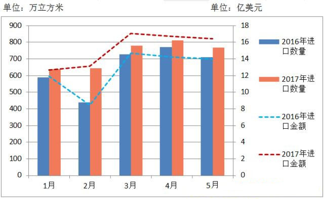2017年1-5月,木材進(jìn)口總量同比去年增長(zhǎng)14%,總額高出20.1%。
