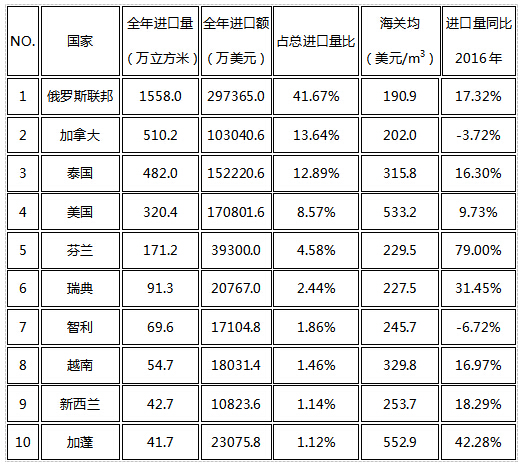 其中,進(jìn)口來源國排名前十的國家分別是俄羅斯聯(lián)邦1558.0萬立方米,加拿大510.2萬立方米,泰國482.0萬立方米,美國320.4萬立方米,芬蘭171.2萬立方米,瑞典91.3萬立方米,智力69.6萬立方米,越南54.7萬立方米,新西蘭42.7萬立方米,加蓬41.7萬立方米。