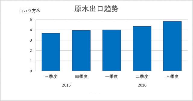 博裕木材進口報關(guān)行獲悉,第三季度,新西蘭針葉材原木出口迎來飛躍,創(chuàng)下483萬立方米的出口新紀(jì)錄,也是連續(xù)第四個季度的上漲。第三季度的出口量環(huán)比上漲11%,與去年同期相比飛升34%。2016年前三個季度,新西蘭原木出口已達到1310萬立方米,相比2015年同期增幅達到14%。