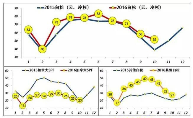 前10月白松累積進口672萬,其中加拿大SPF木材的大幅下降18%,而俄羅斯、芬蘭、瑞典為代表的北歐云杉狂飆50%,一舉挽回白松的頹勢,仍完成9%的總量增長。近年歐洲白松以其較高的性價比不斷取代加拿大SPF,進入10月以來由于俄材價格持續(xù)上漲,SPF市場需求量略有回升。